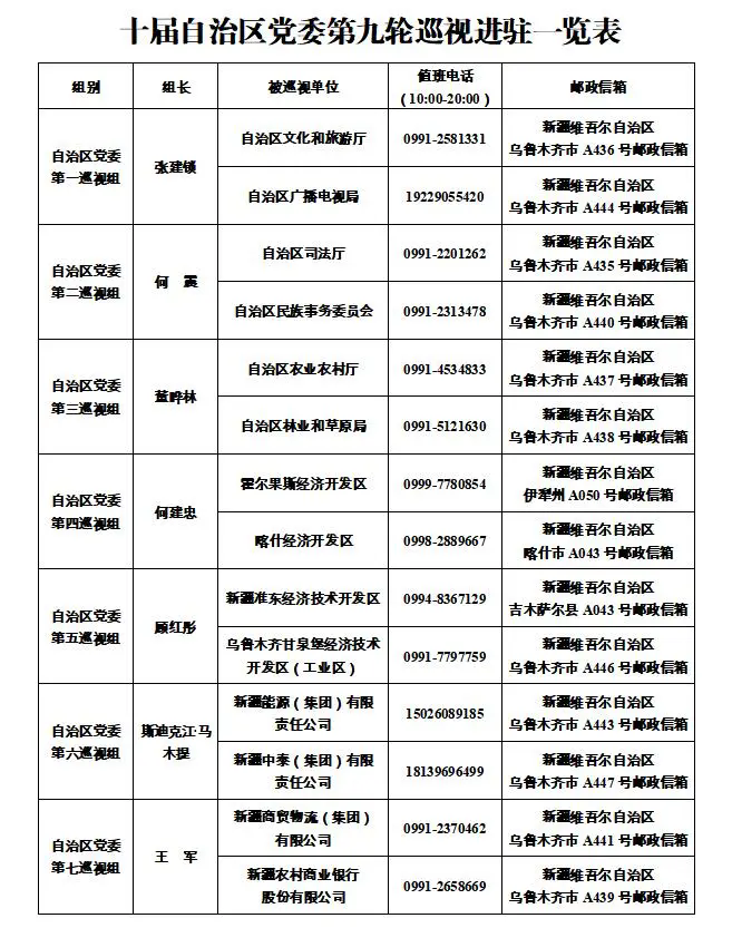 据悉,7个自治区党委巡视组将在被巡视部门(单位)、开发区、国有企业工作2个月左右,巡视期间设立专门值班电话、邮政信箱及巡视二维码,主要受理反映被巡视党组织领导班子及其成员、下一级党组织领导班子主要负责人和重要岗位领导干部问题的来信来电来访,重点是关于巡视整改方面问题以及违纪违法问题的举报和反映。巡视组受理信访时间截止到2026年6月1日。